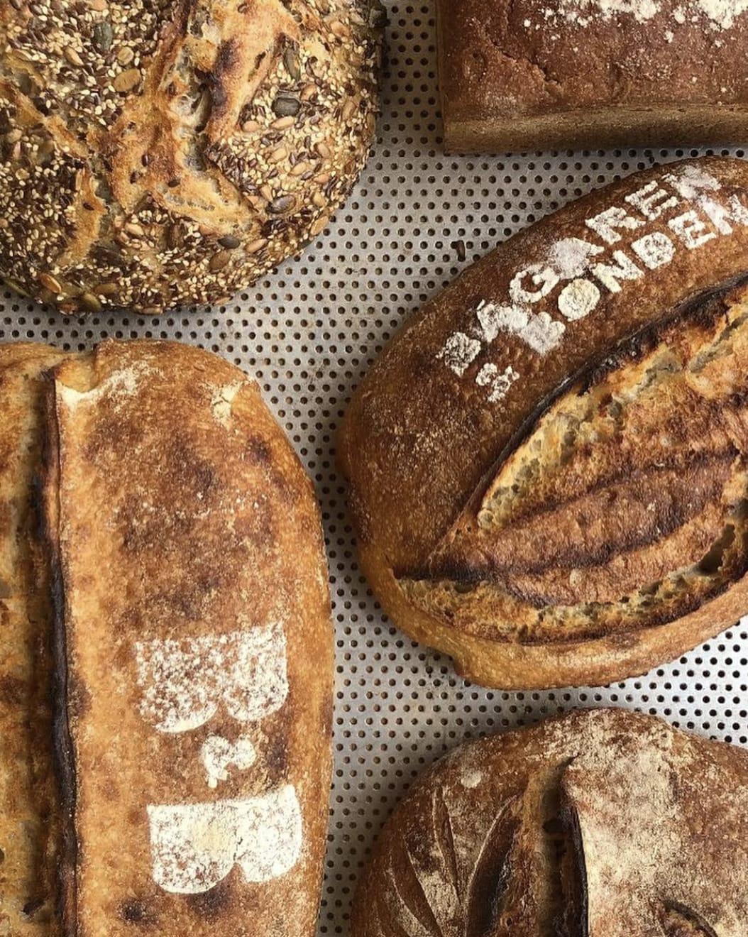 Vi bakar oftast surdegsbröd. Oftast helt utan jäst, det beror lite på. Fråga gärna vad vi haft i bröden och hur vi jäst dem och så. Det tycker vi är kul att prata om.