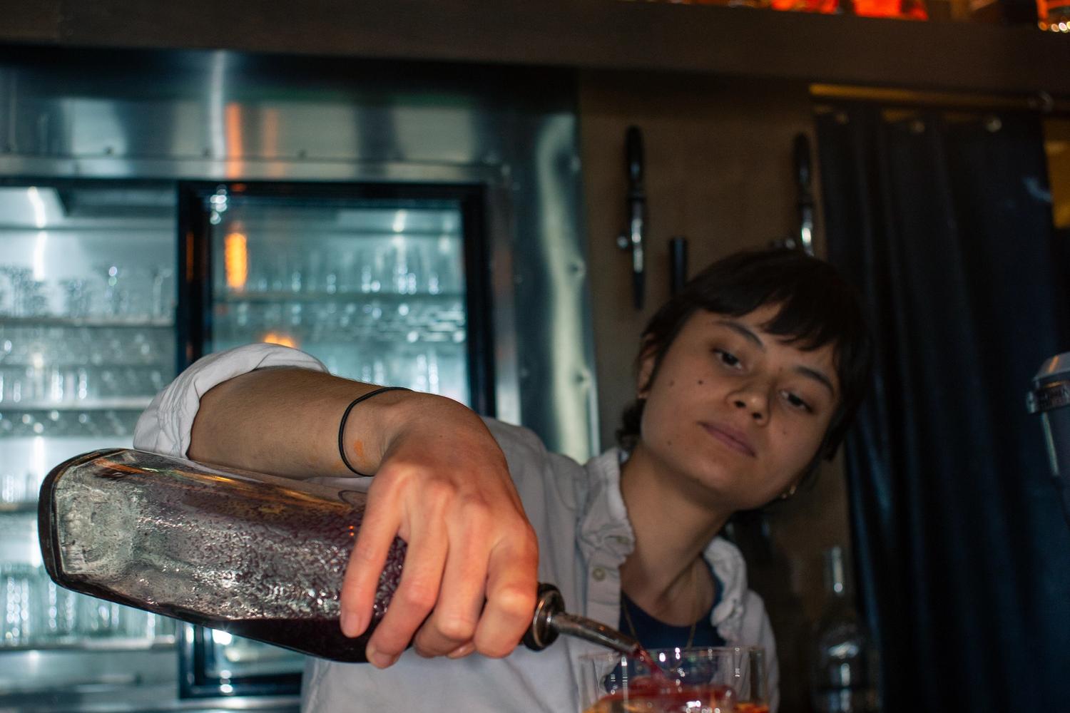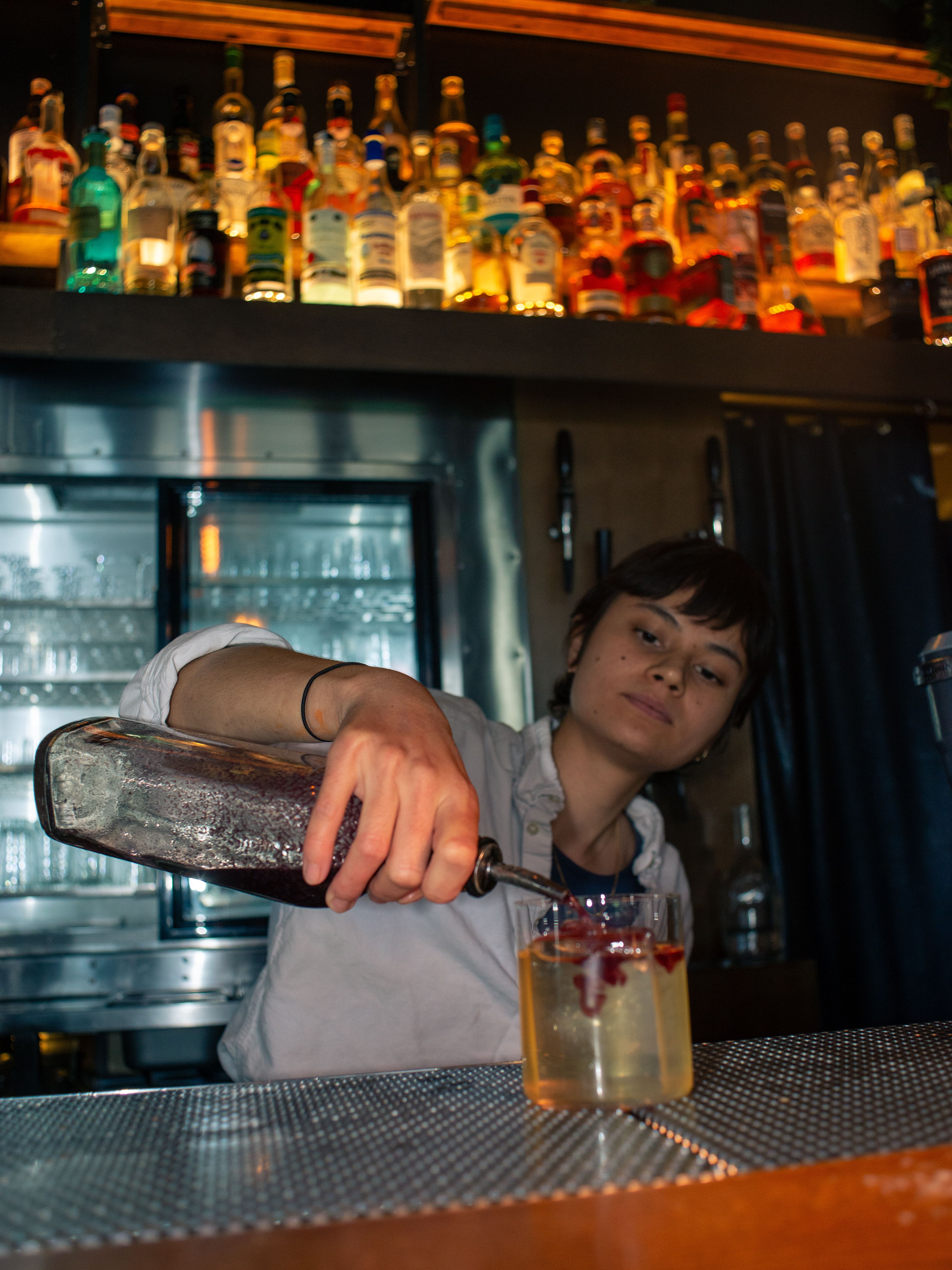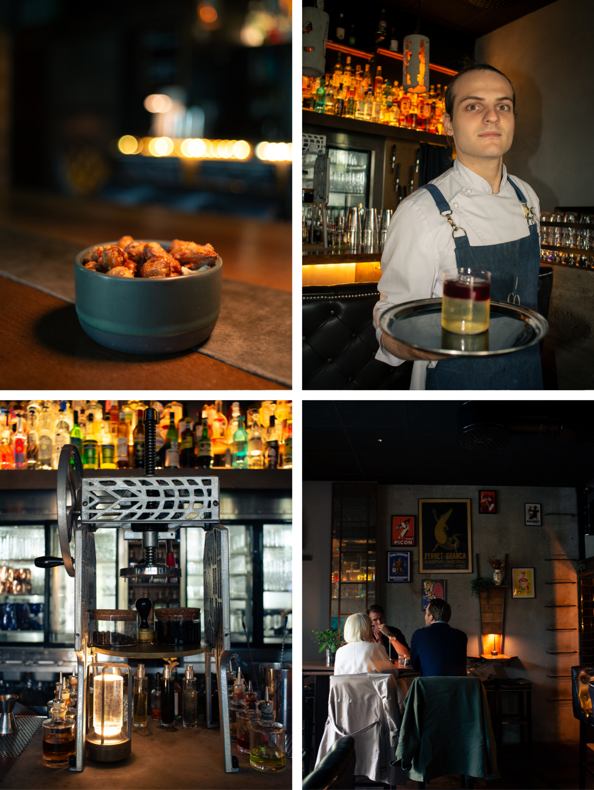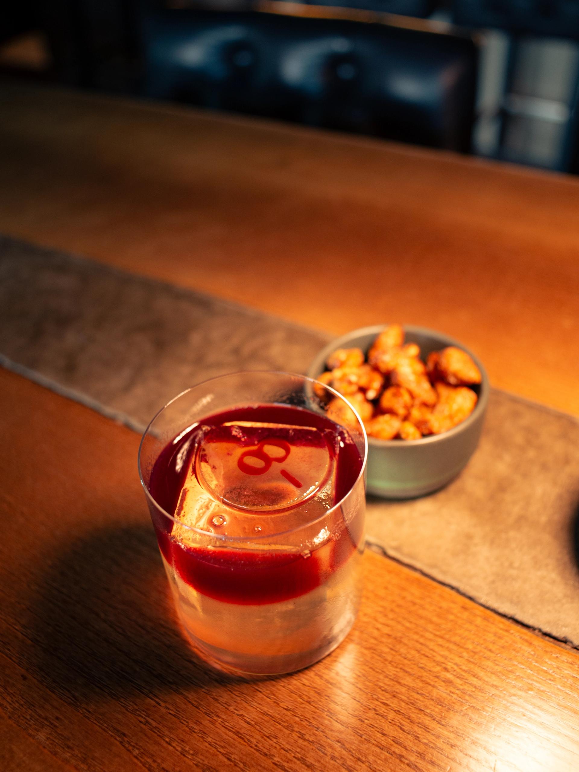 Jag satte mig ner och beställde en New Harbour (Care/of bourbon blend, citrus, lillet, sugar, float strawberry wine) samt karamelliserade mandlar. Det första som slog mig när New Harbour blev placerad på bordet framför mig var dess märkvärdiga skönhet. Det låter kanske lite överdrivet att använda ordet “skönhet”, men det var min upplevelse. Det var en mycket tjusig, visuellt tilltalande drink. Smaken, fräsch och välbalanserad! De karamelliserade mandlarna var det perfekta komplementet.