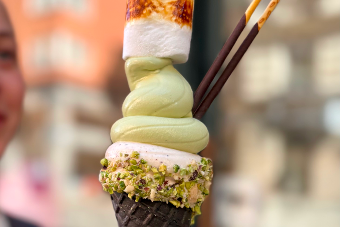 Och vi hamnar i gullighetschock när glassarna serveras. De överdådiga strutarna ser ut som små konstverk med tydliga influenser från Japan. Pockysticksen som tryckts ned i toppen av glassen vittnar om en flört till den populära subkulturen Kawaii. Och smaken är fantastisk.