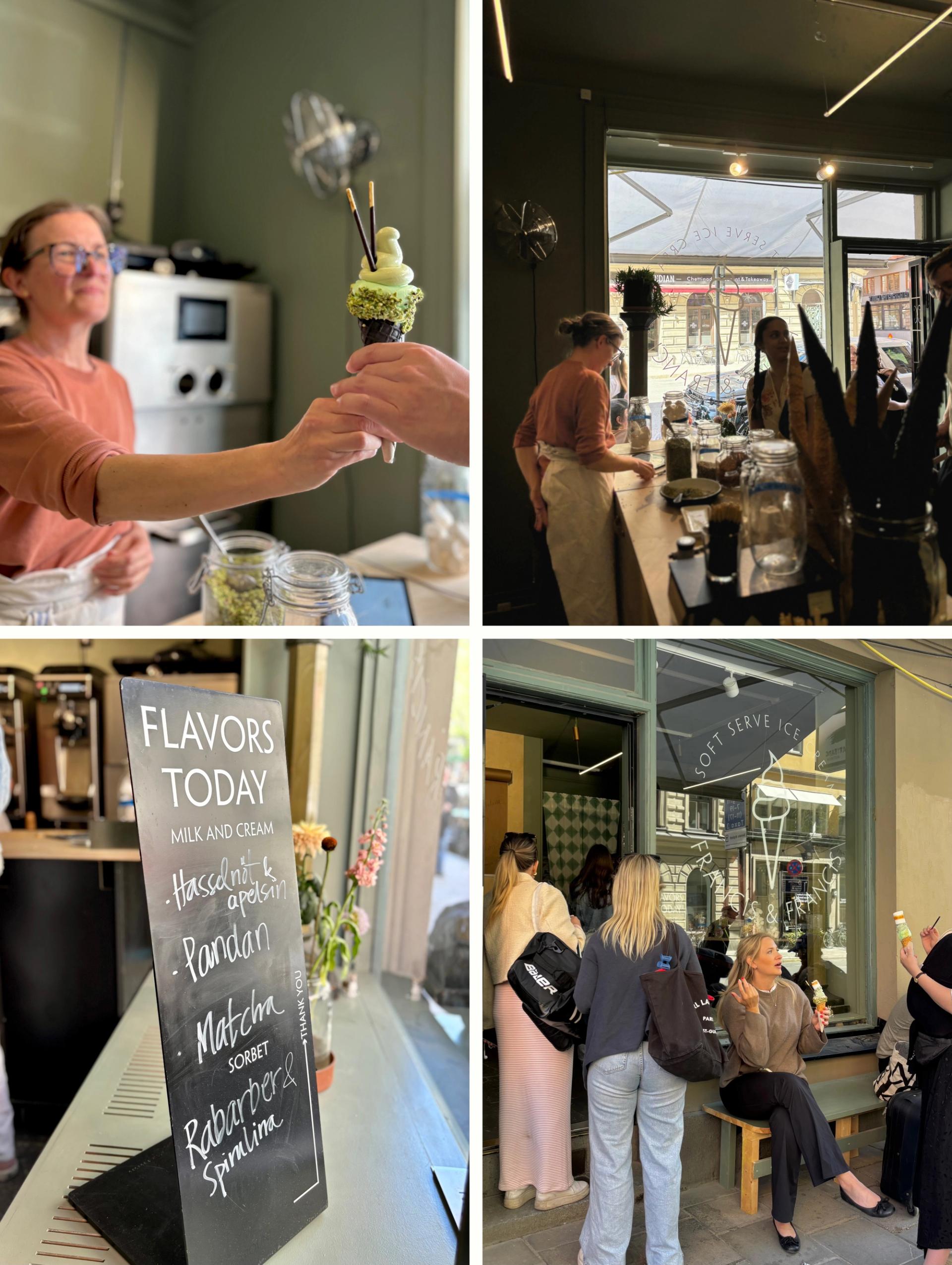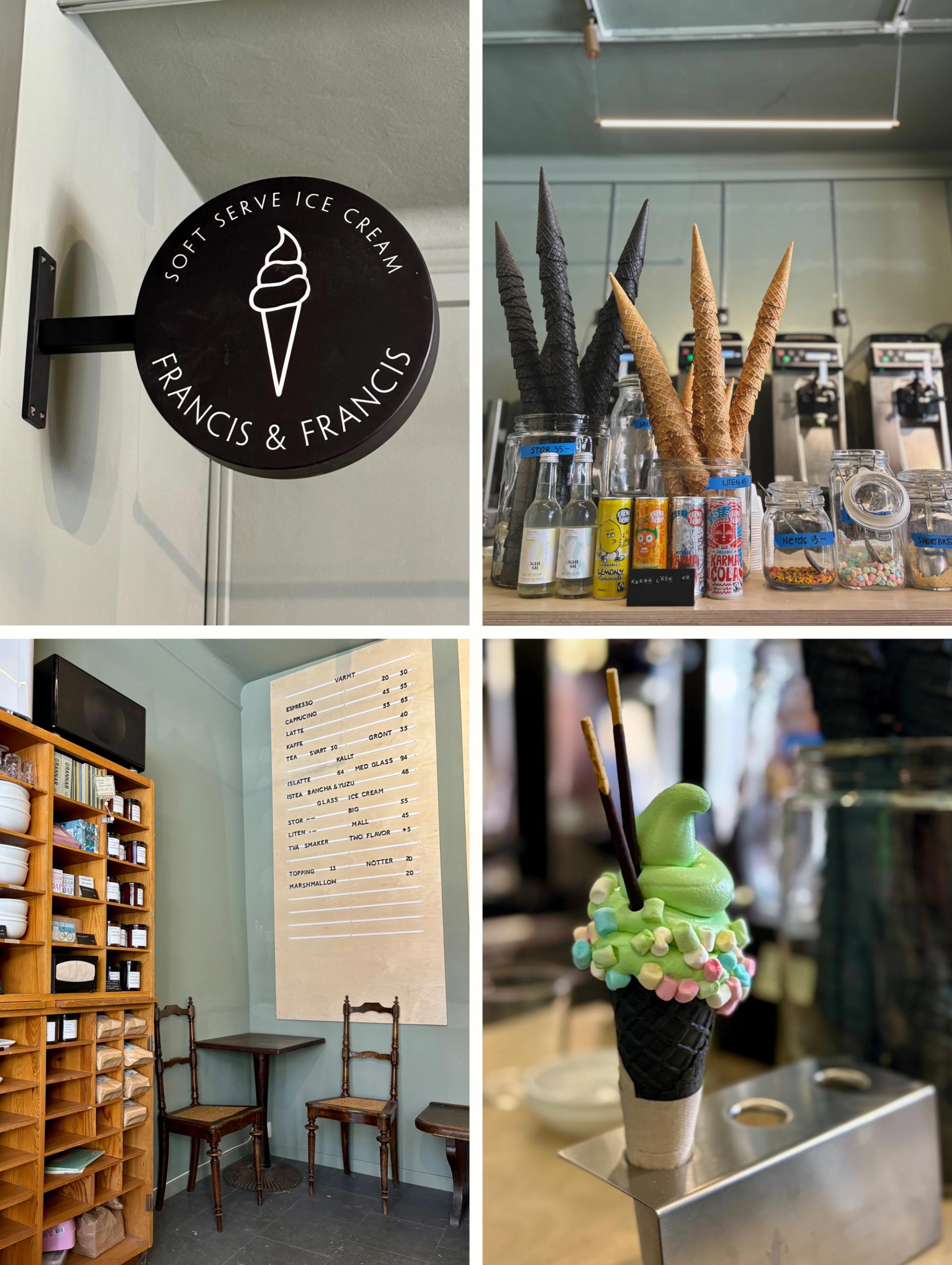 Pernilla som driver Francis och Francis får den simpla lokalen på Rådmansgatan att kännas hemtrevlig med sin utstrålning och närvaro. När hon för några år sedan var på semester i Hong Kong fick hon för första gången syn på hantverksmjukglass i klassiska, asiatiska smaker. Efter resan väcktes en idé om en egen mjukglasskiosk hemma i Stockholm, och snart blev den verklighet.