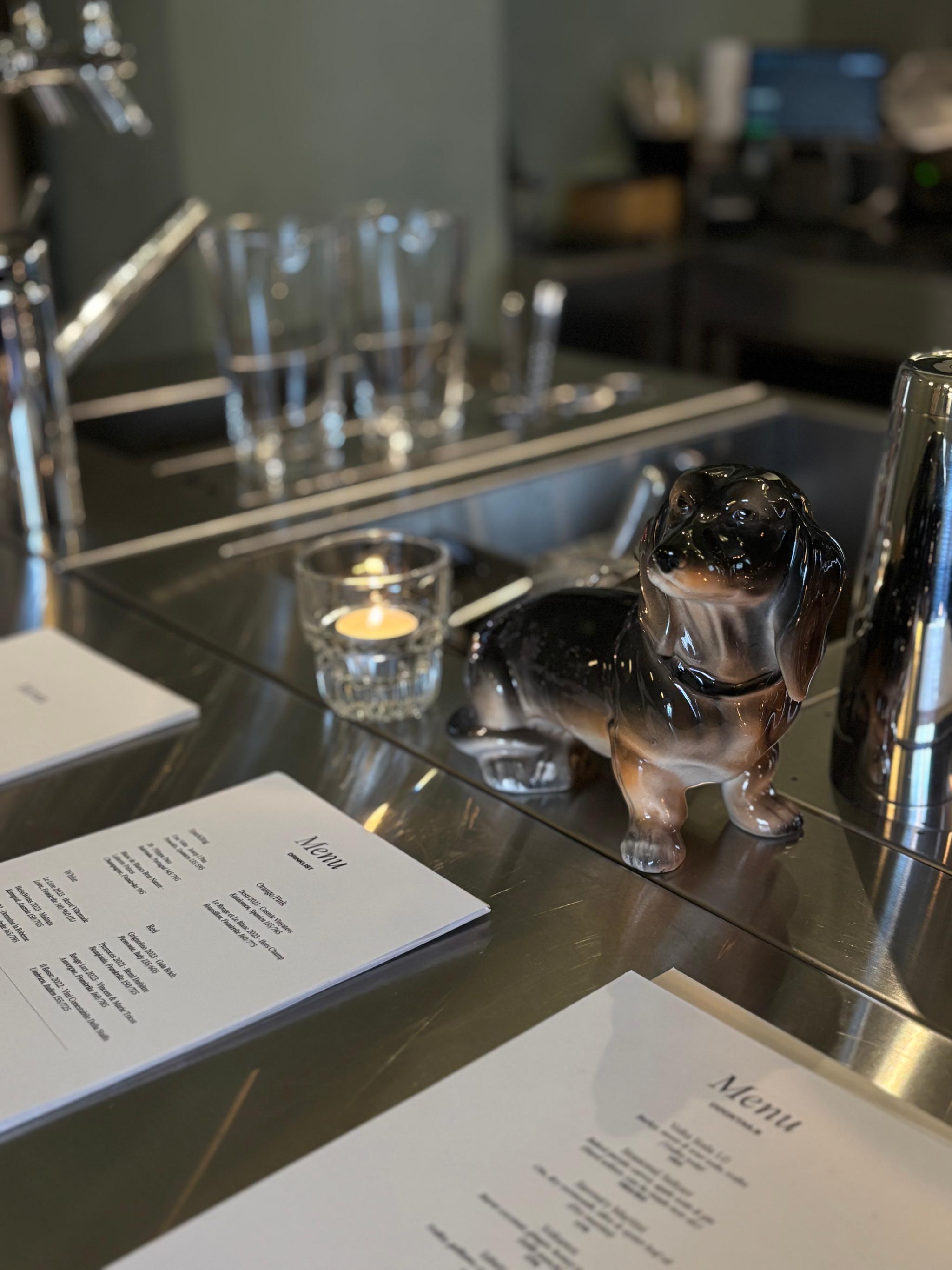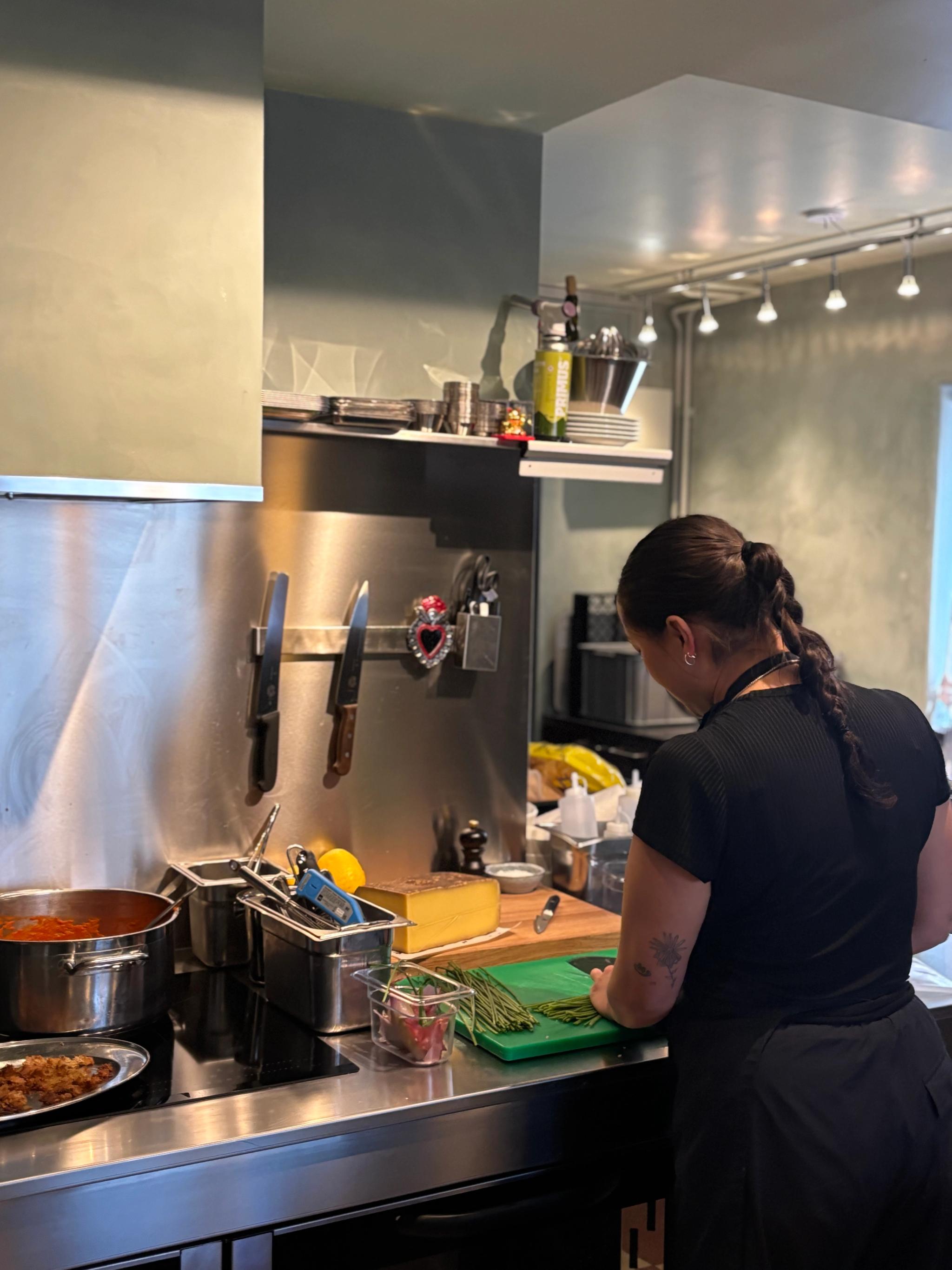 Den lilla lokalen rymmer en stilren bar med ett öppet kök där Stephanie Chi Forsell står för den kreativa menyn. Maten är simpel och anpassad för just barhäng, men med det sagt går det även fint att äta sig mätt. Menyn har just blivit uppdaterad, men till en början berättar Stephanie leendes om hur Miranda varit besatt av paj och därav såg till att en chicken pot pie hamnade på menyn.