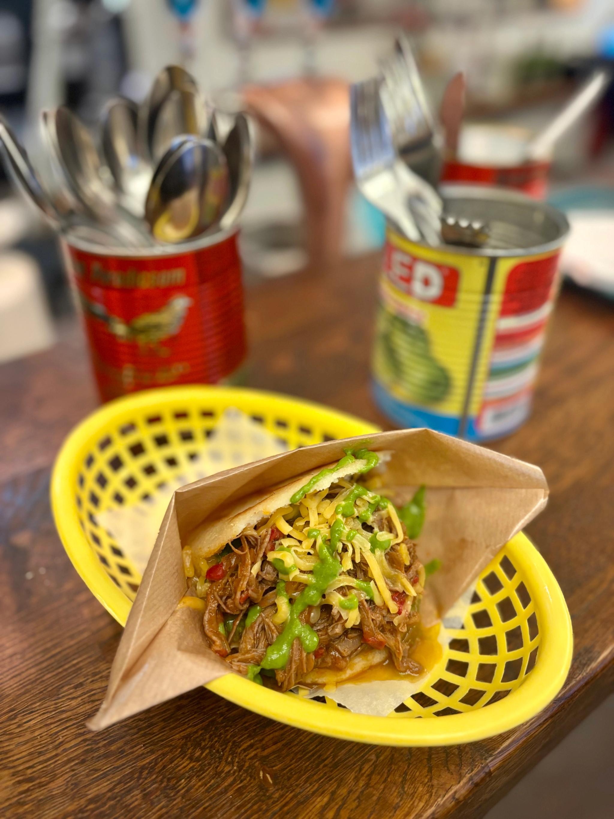 Den mest klassiska varianten – och Santa Salsas storsäljare – är Arepa Pelúa. För Maikel var det viktigt att behålla den nostalgiska och genuina känslan. Fyllningen består av långkokt flankstek i sofrito, ost och en grön chilisås. Receptet kommer från Maikels farmor.