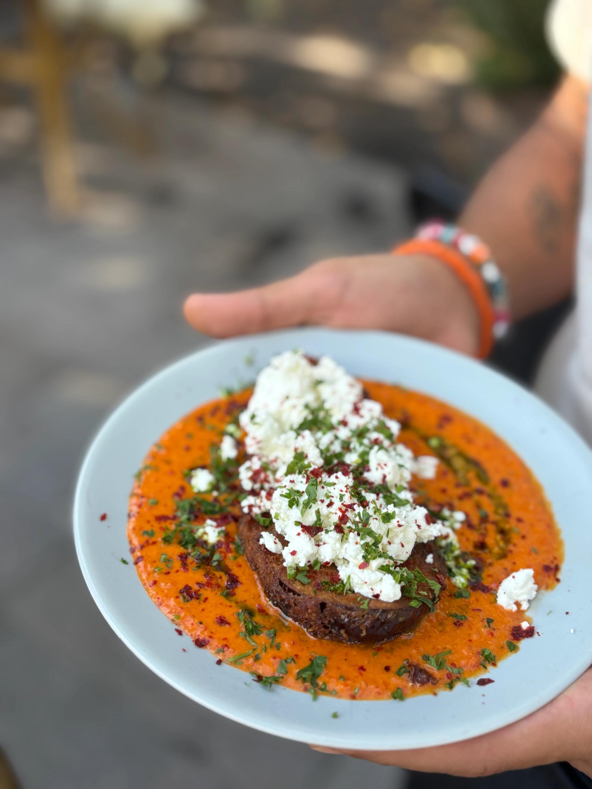 Vi får följa med in i köket när signaturrätten tillagas: friterad aubergine med harissasmörsås, fetaost, persilja och aleppopeppar. Doften av den kryddiga såsen fyller rummet, och upplägget är lika vackert som inbjudande.